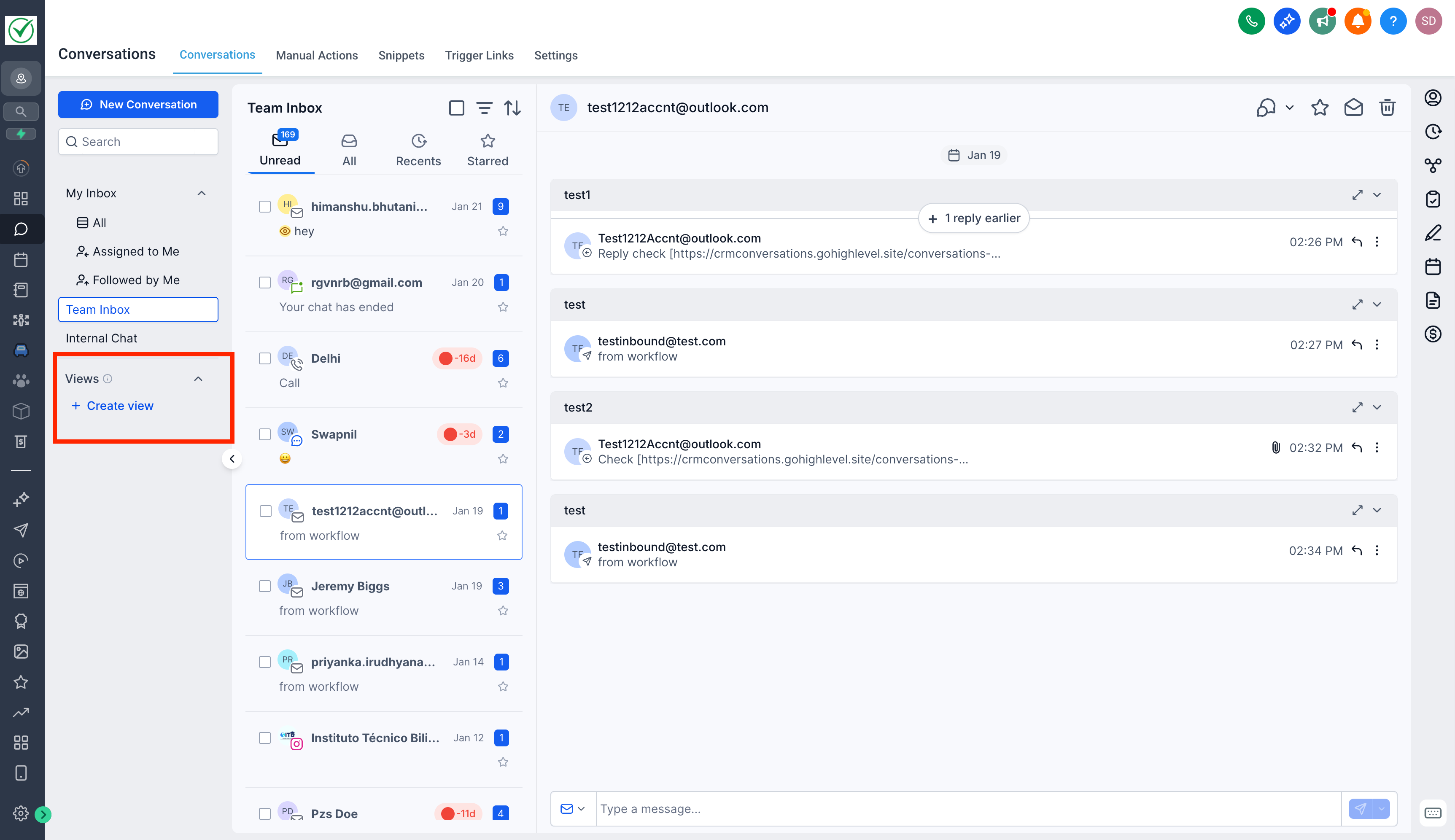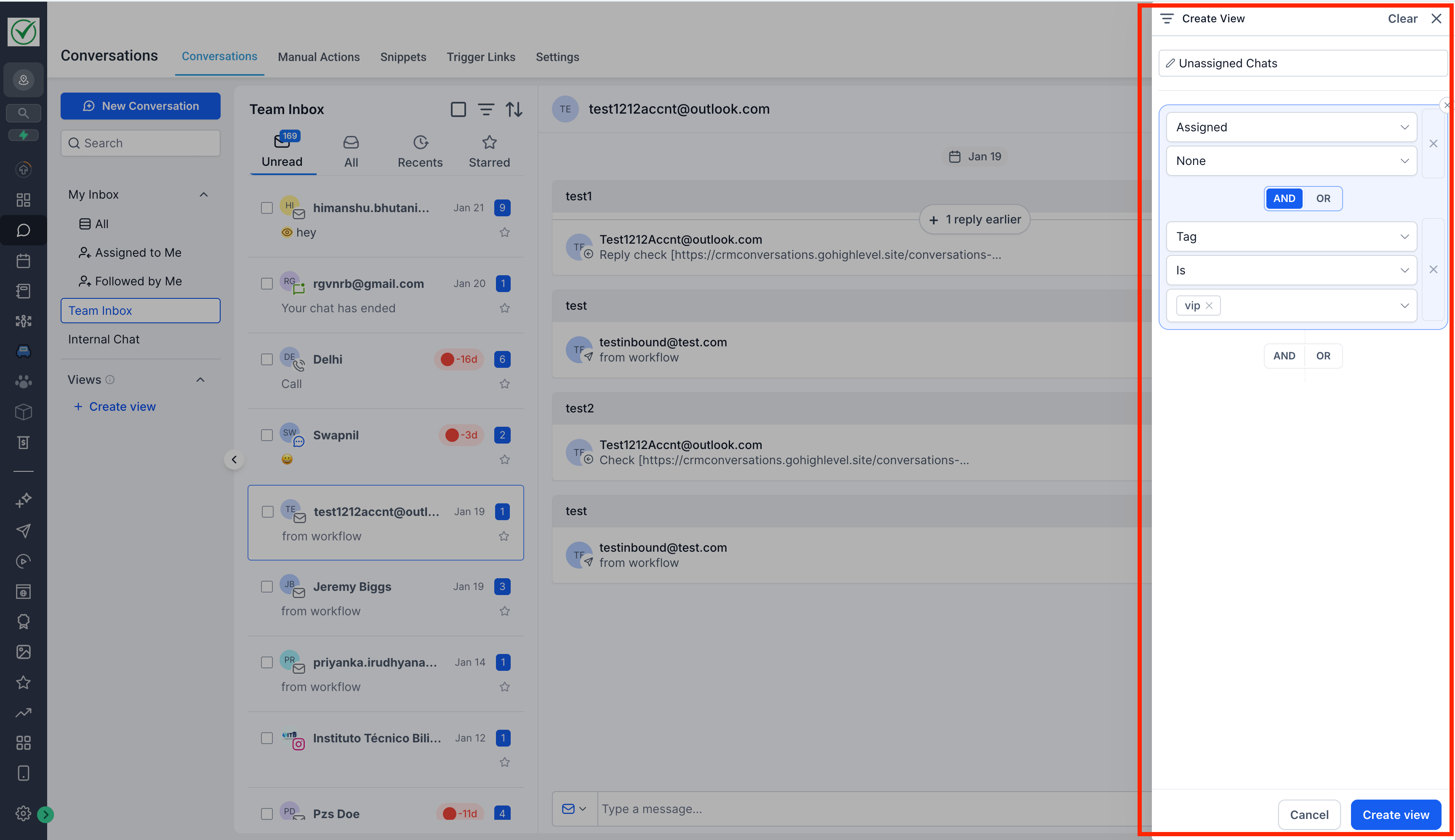 Add the required filters and provide a name for the view, Once View is created, it is added to the Inbox panel and displays all conversations matching the applied filters.