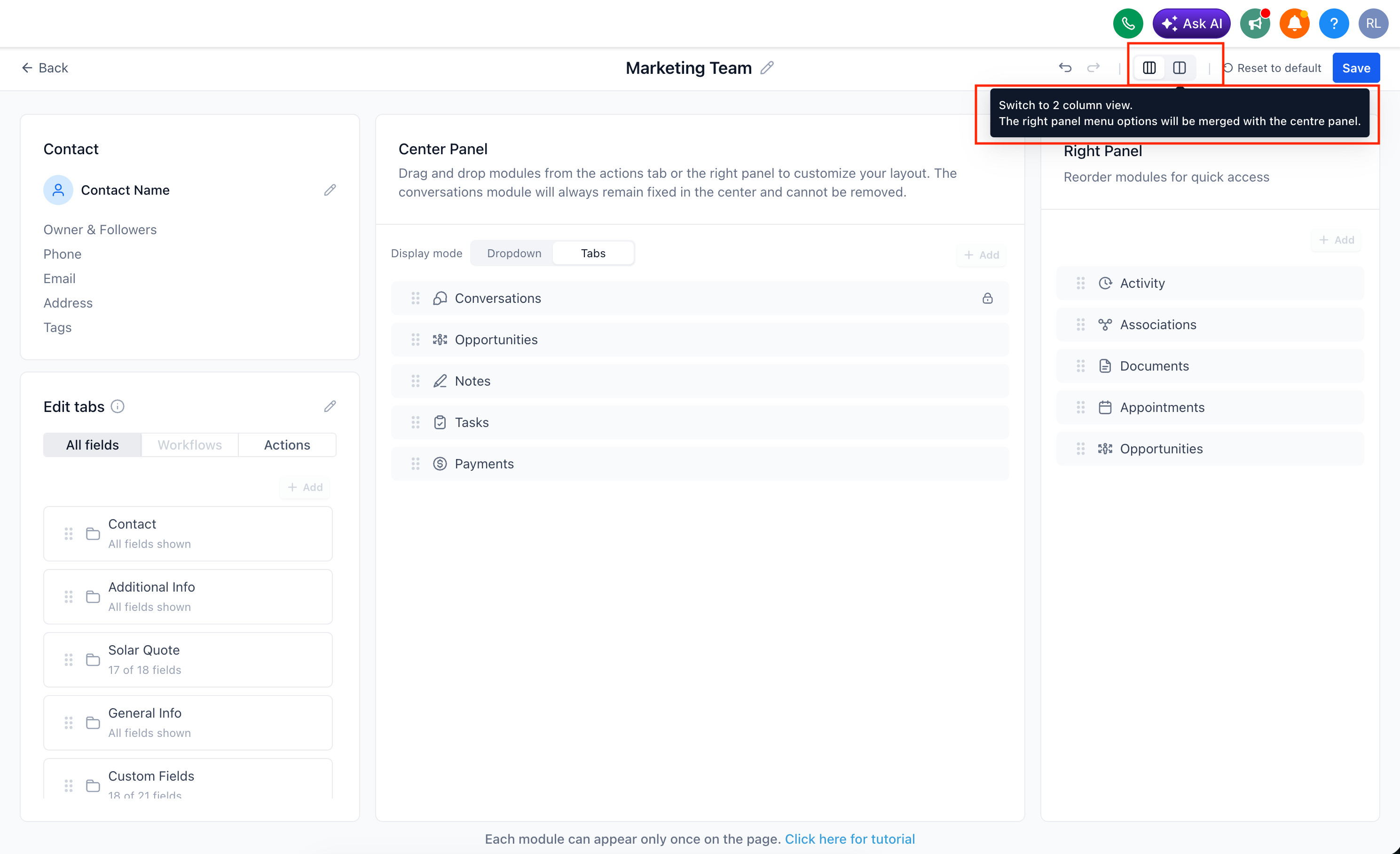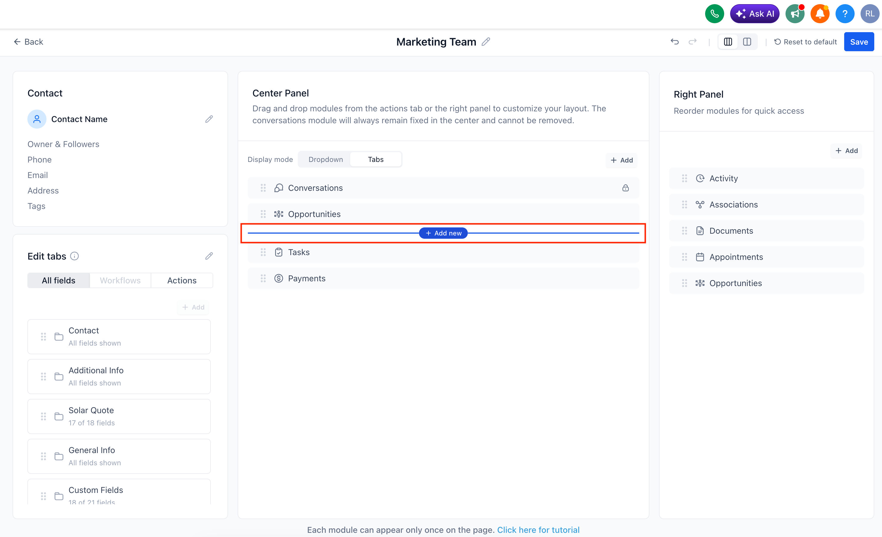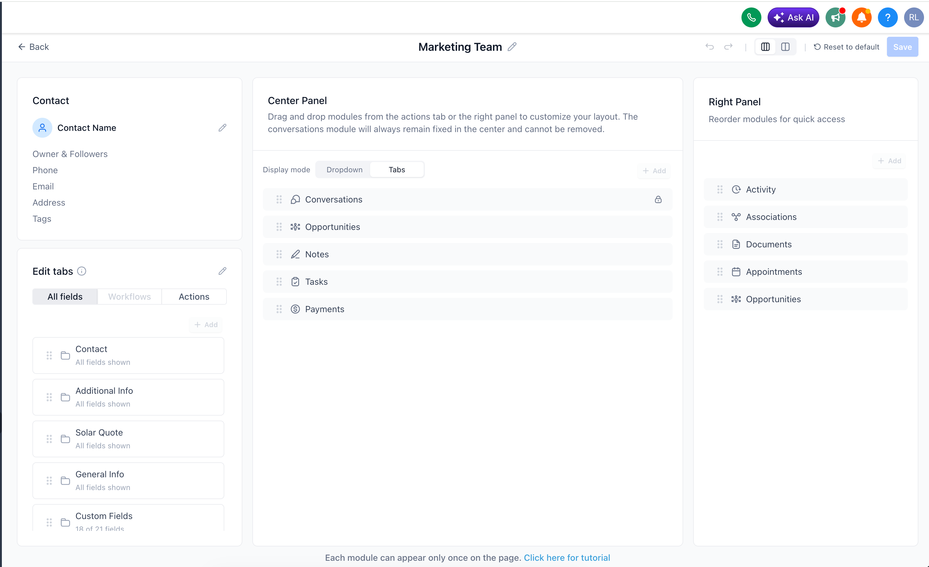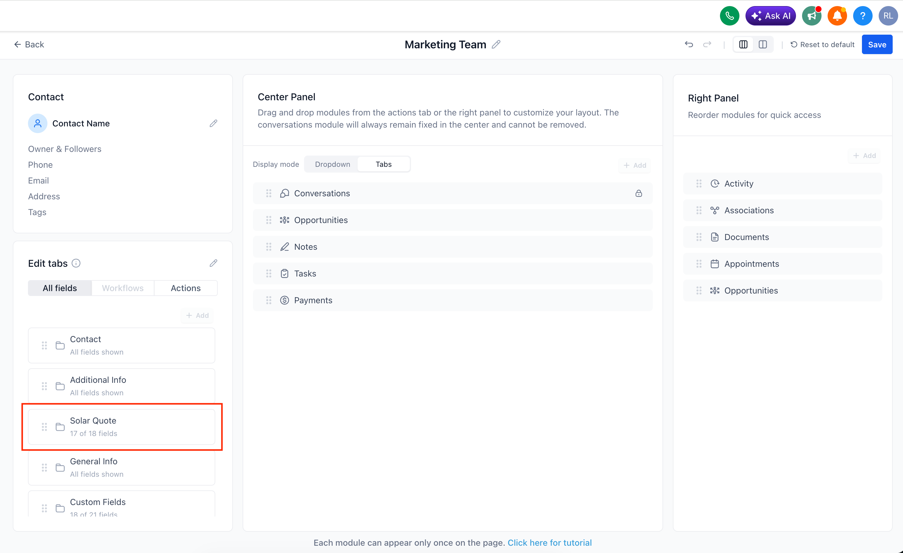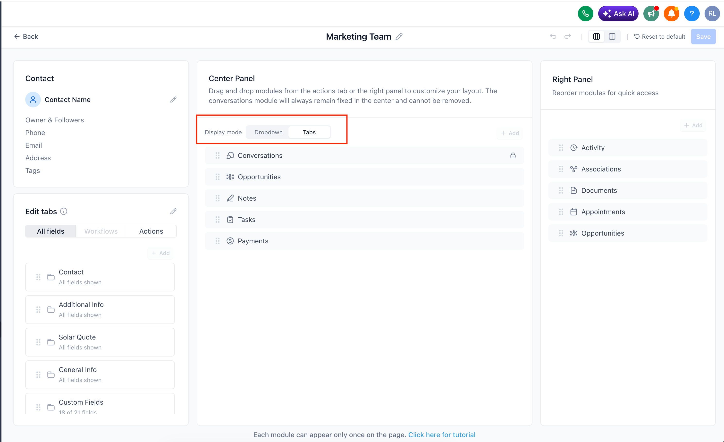 Design layouts by rearranging modules, choosing panel structures, and selecting display formats (tabs/dropdowns)