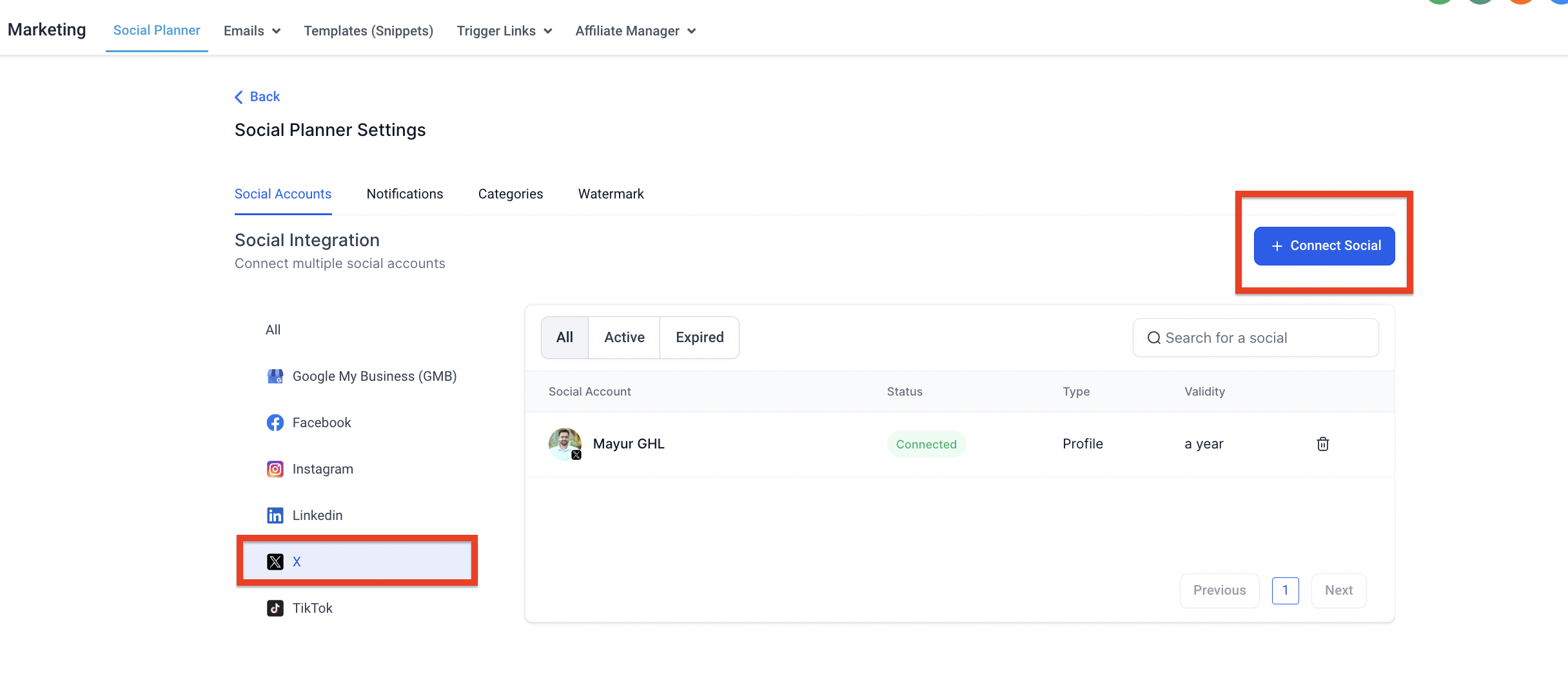 The next step is to click on connect a new Twitter (X) Account of the table as shown below to manage.