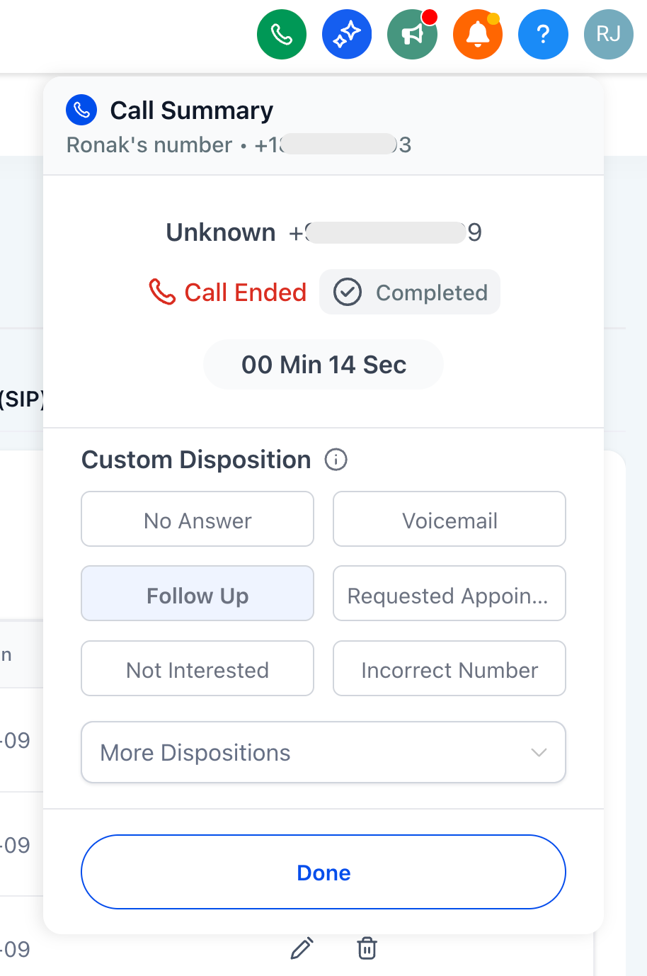 Custom Dispositions: Choose an outcome for your call. Use it to trigger workflows.