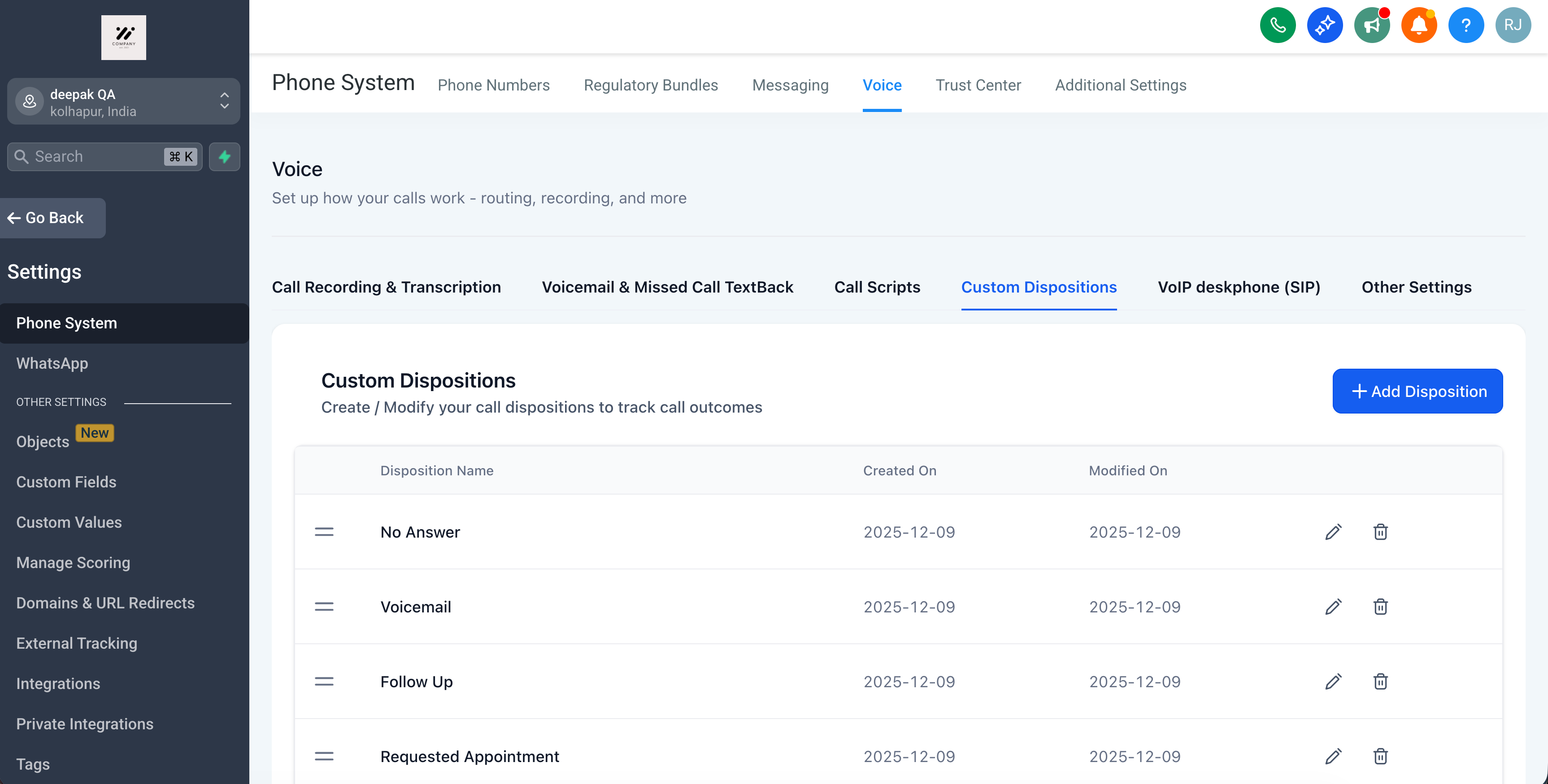 1) Go to Settings -> Phone System -> Voice -> Call Dispositions