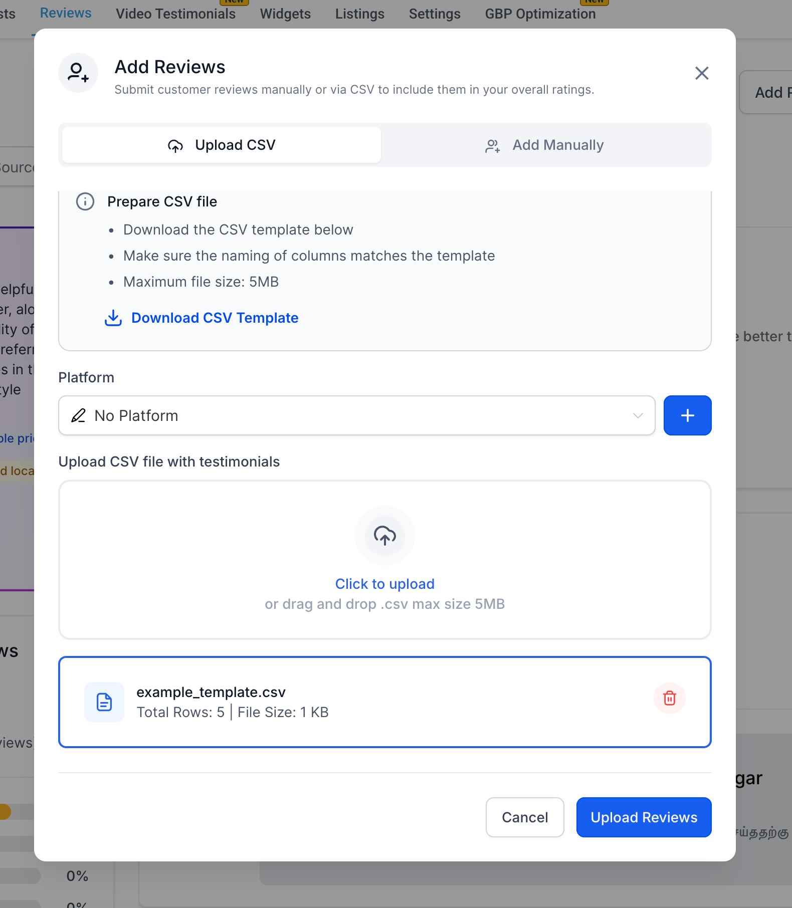 Import multiple reviews at once using our new CSV uploader.