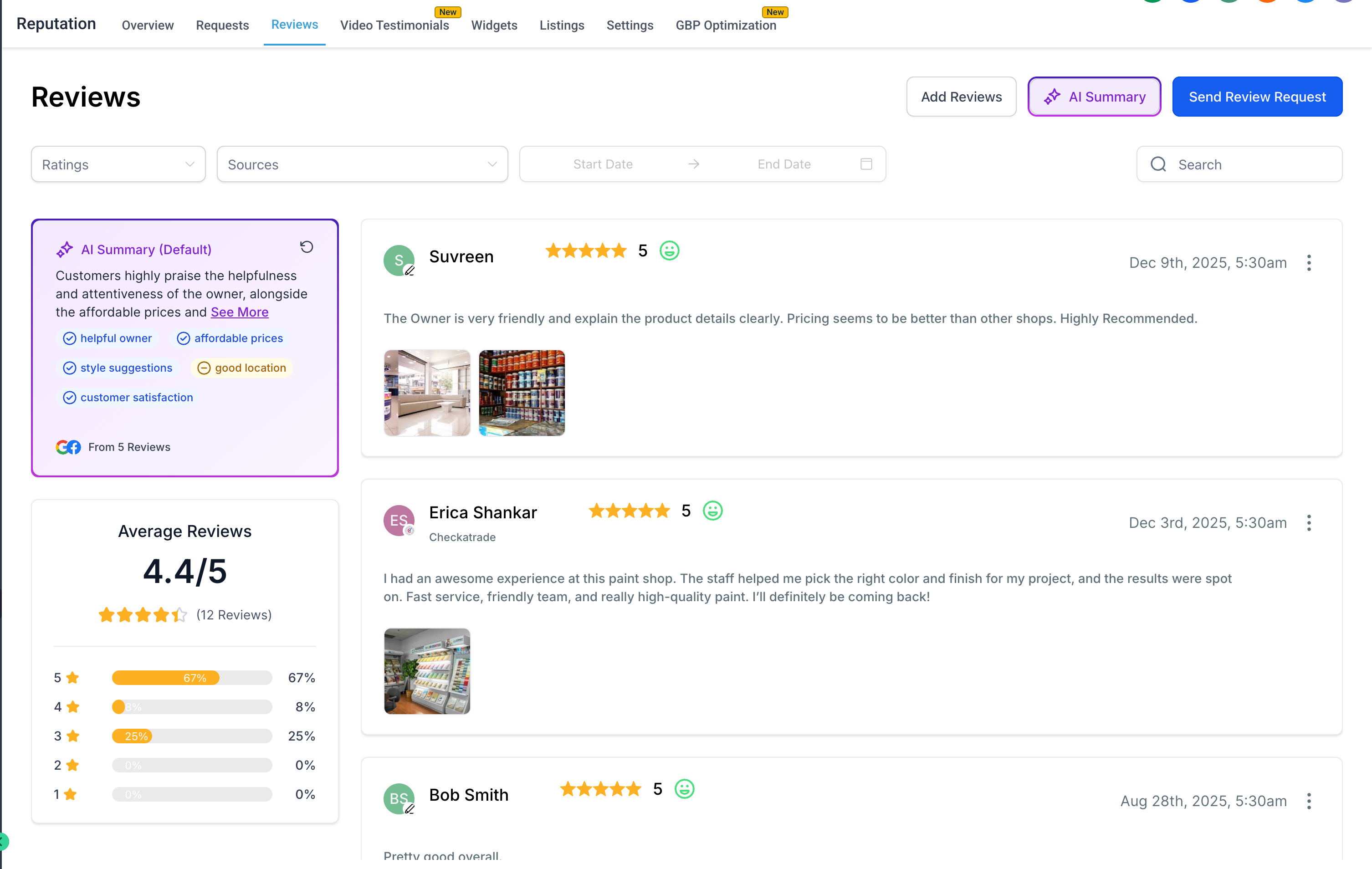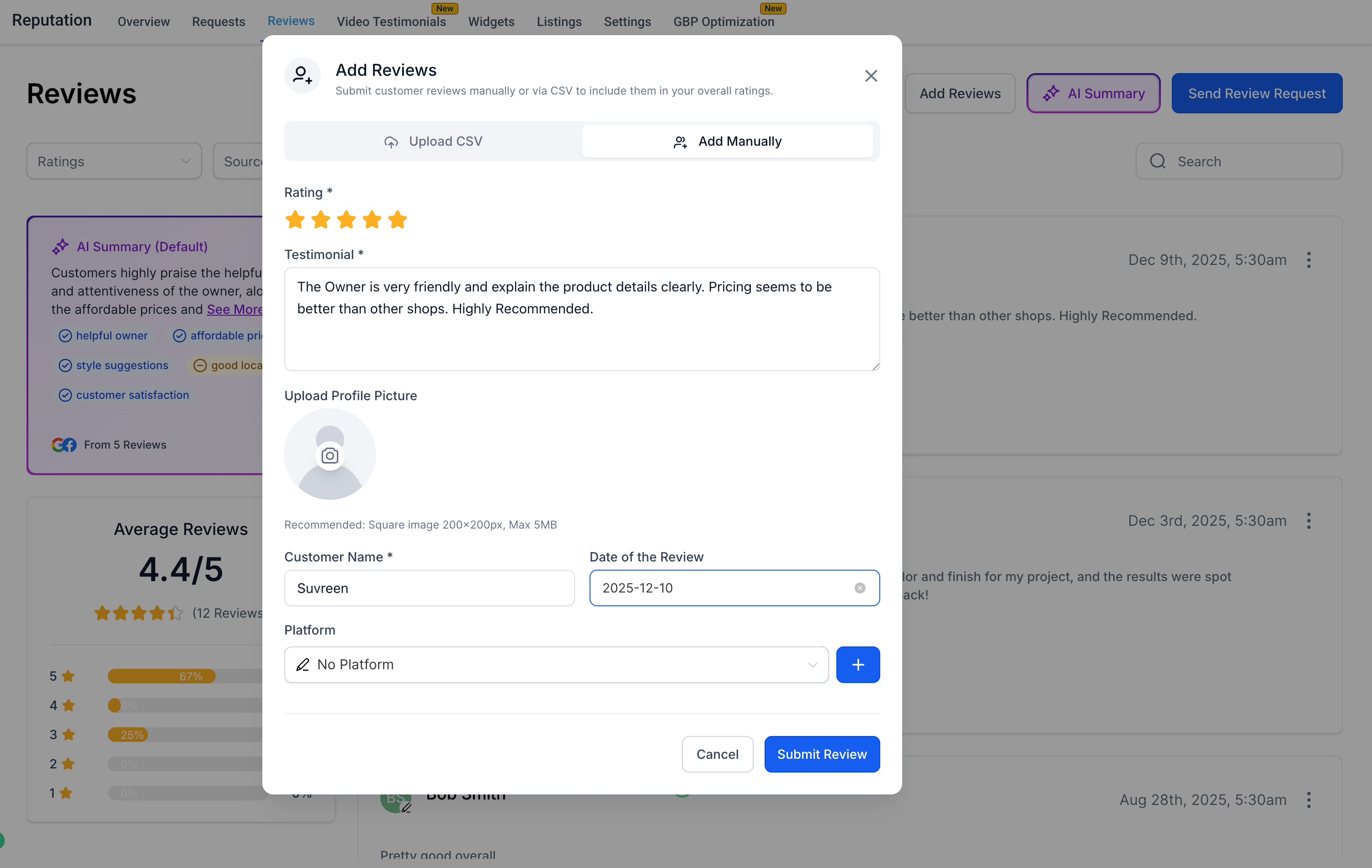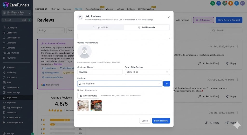 Manual reviews now appear directly inside your Reputation → Reviews list, alongside Google and other sourced reviews. New capabilities include: