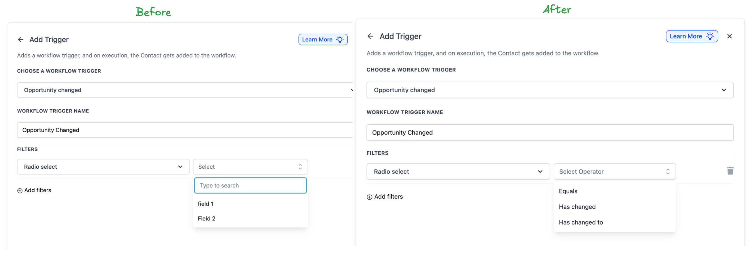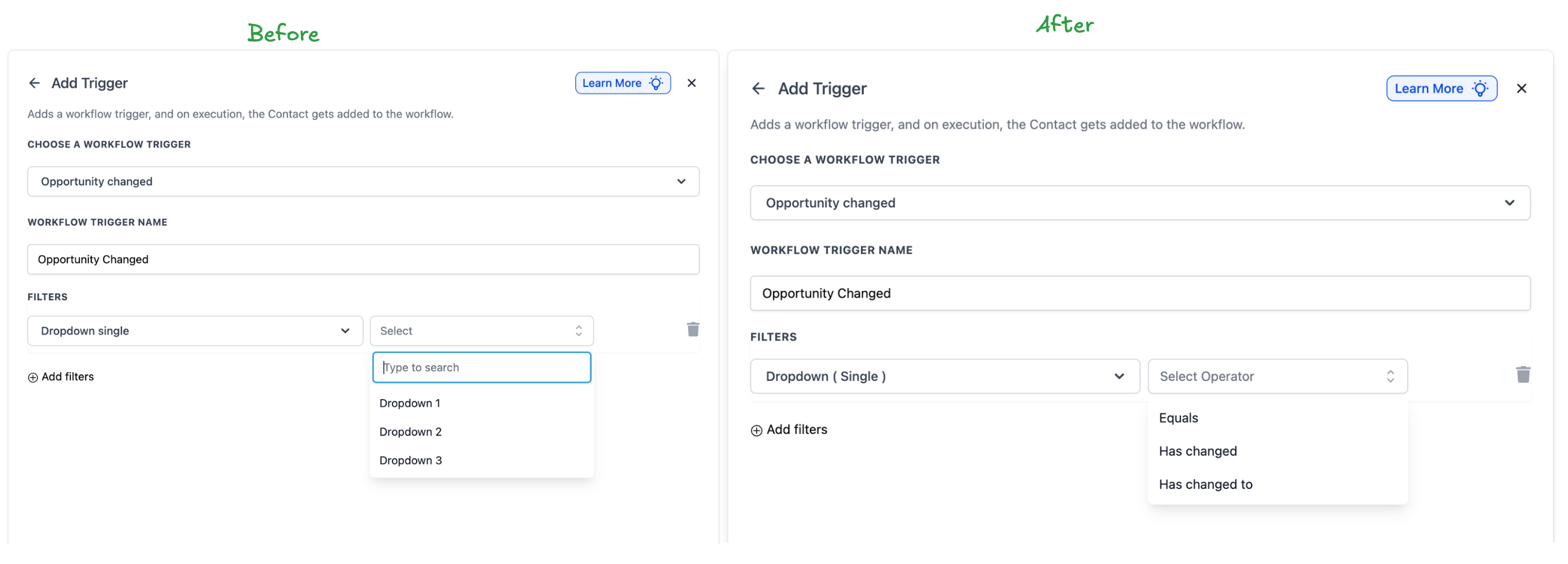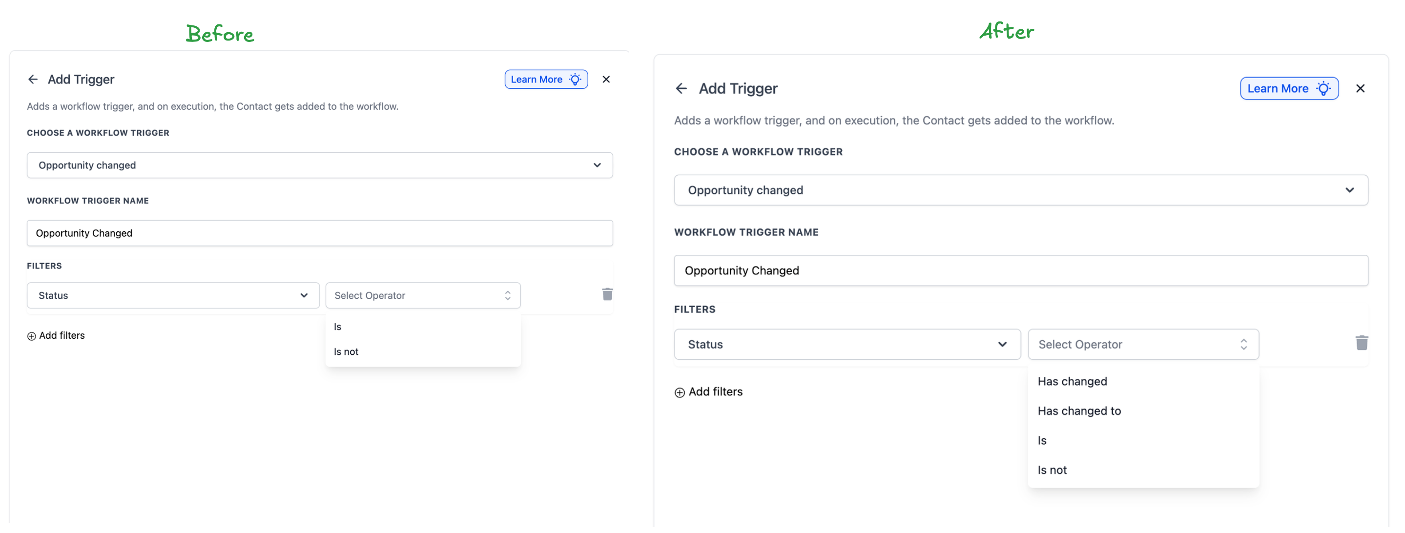 The Opportunity Changed trigger now supports event-based operators. Previously, this trigger worked as a filter—firing for any change on opportunities matching specific field values. Now, with Has Changed and Has Changed To operators, you can trigger workflows only when a specific field actually changes.
