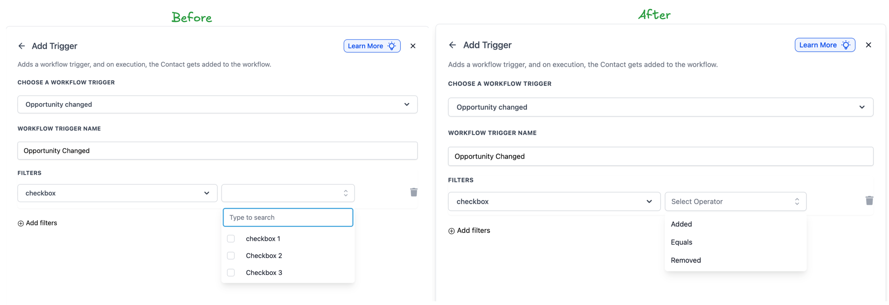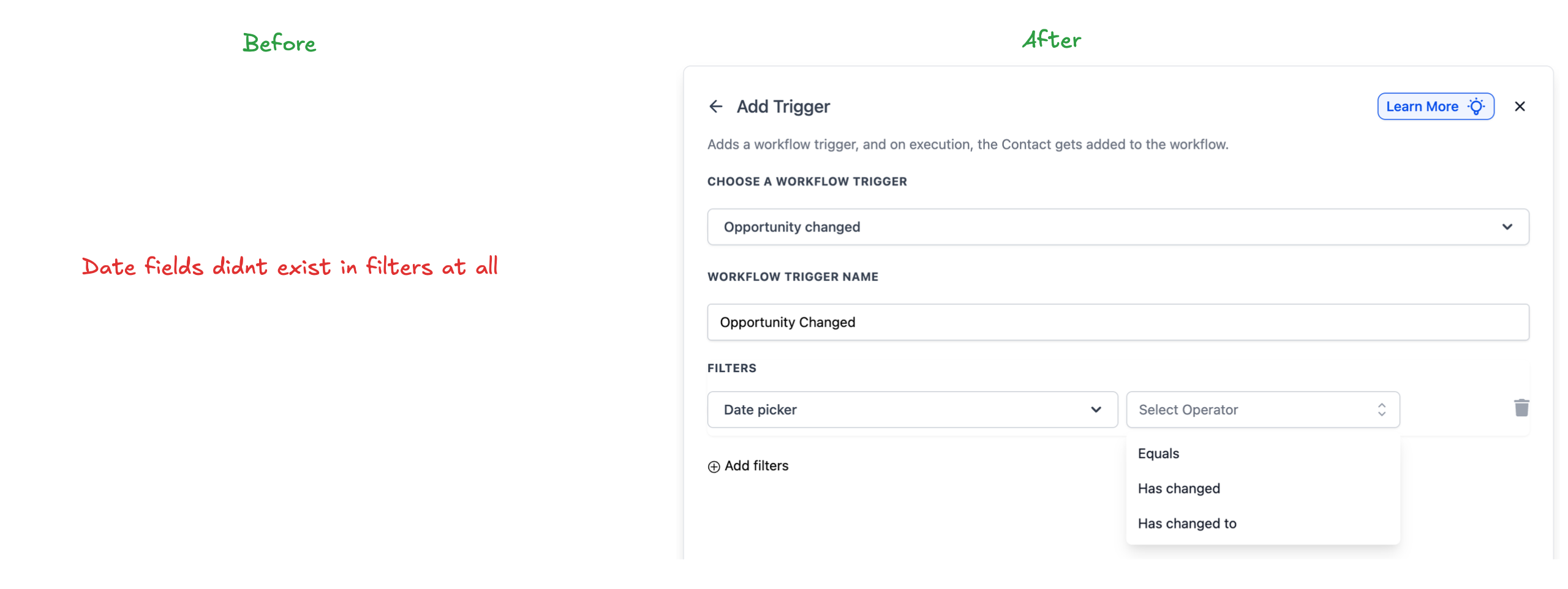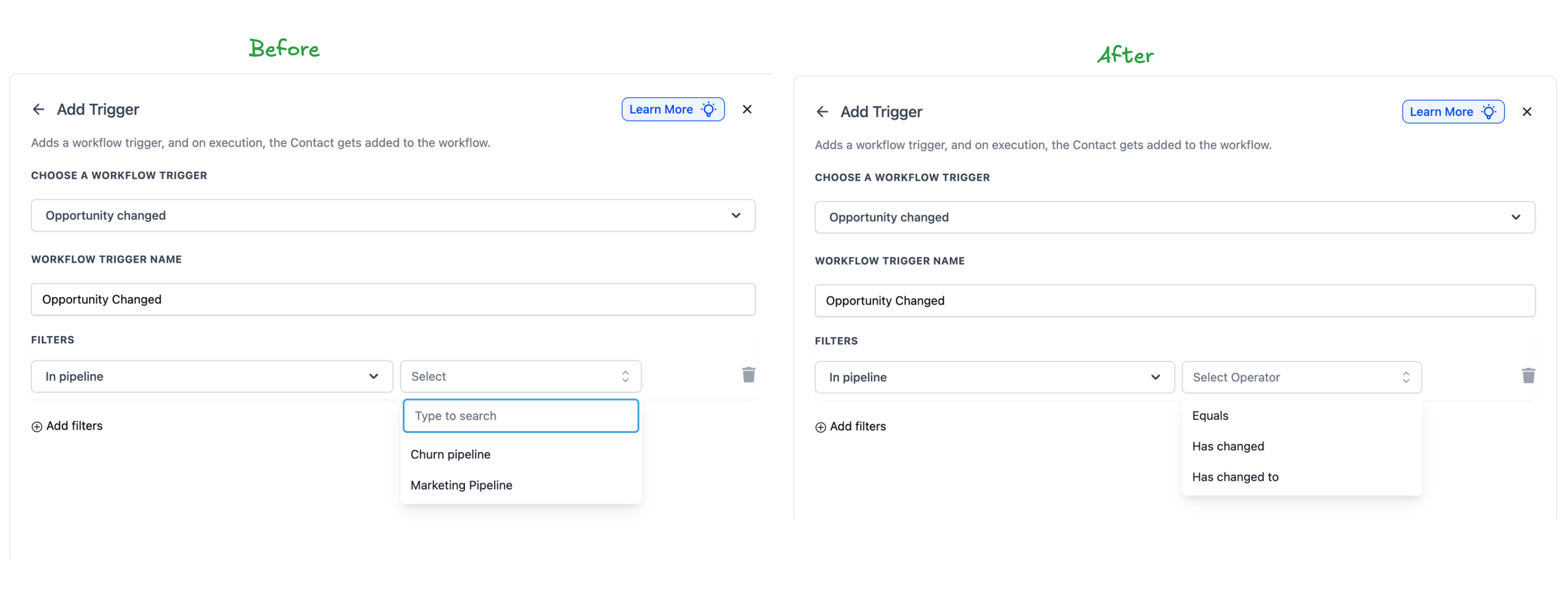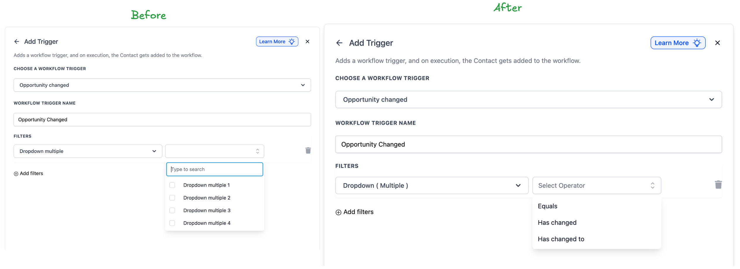 The Opportunity Changed trigger now supports event-based operators. Previously, this trigger worked as a filter—firing for any change on opportunities matching specific field values. Now, with Has Changed and Has Changed To operators, you can trigger workflows only when a specific field actually changes.
